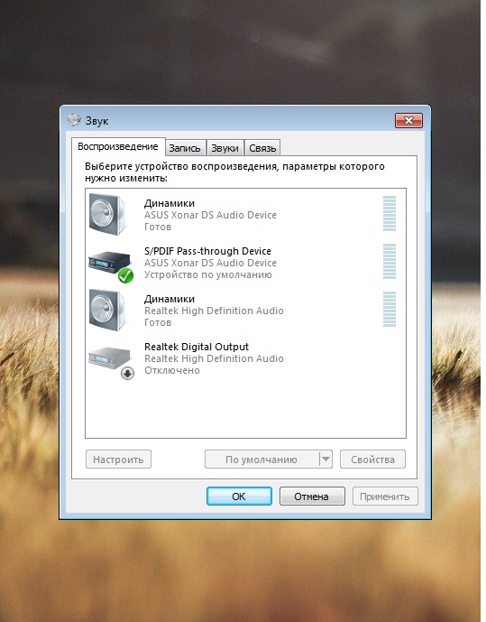 zanin при включенной цифре у карты должно быть 2 выхода: Asus Xonar DG (динамики) и Asus Xonar DG (spdif) |