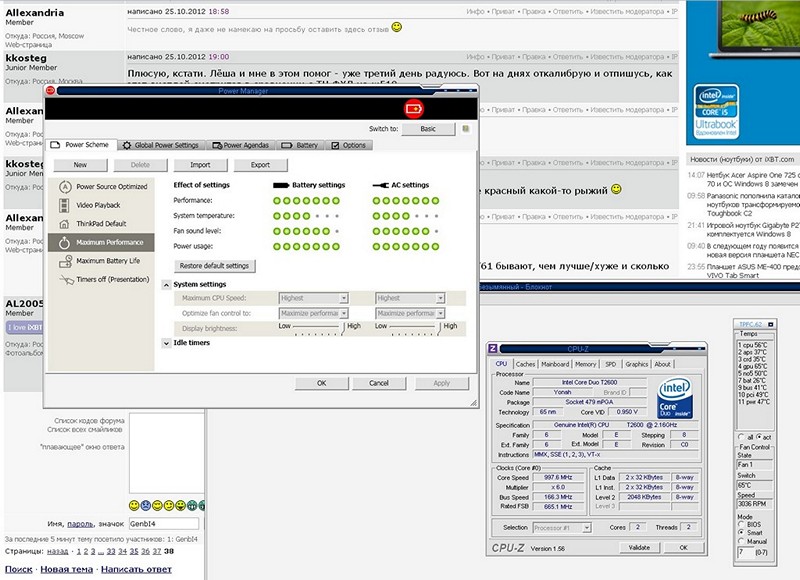 Короче, кажется все более-менее. По крайней мере, при установке "максимум перворманс" стабильно показывает 2.16. При установке "дефолт" - в покое снижает до тех же 997-и. Как будет под нагрузкой пока не понял. Температура процессора не поднимается выше 59, в покое вообще около 50-и. Сейчас, к примеру 47. Правда с видео остались вопросы. В покое показывает около 70-75. Только при запуске HD видео подскакивает до 85. При конвертации до 92 поднялась. Сильно и долго пока не было возможности нагрузить, но сразу вопрос, какая температура для видео норма? На всякий случай уточню в tpFancontrol "gpu" это и есть видео? Карта у меня АТИ, которая 5200. З.Ы. это у меня уже 4-й ноут, первый раз делал ревизию системы охлаждения - приятно удивлен результатами. |