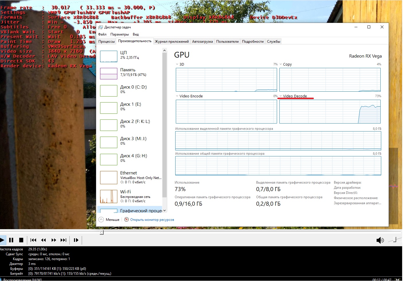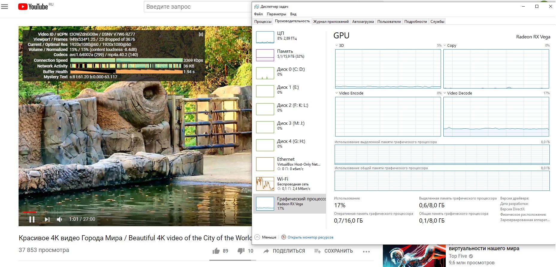zoog В корпусе процессора тоже видеоядро однако. [source=4:135333:61] Только не каждое такое GPU может VP9 аппаратно декодировать. H264 могут многие, но опять таки это всё старше де же времён первых Core 2 Duo. Вот видео с телефона в 4К, процессор не грузит, а вот GPU блок ответственный за декодирование нагружается. Это кстати HEVC 4К 30 FPS :). Добавление от 21.07.2019 17:17: Кстати, теперь возникнет вопрос как процессор телефона может играть такое видео, а тем более писать его. Так там стоит DSP (аппаратный блок), без него бы телефон ни чего не смог, и не может, набор поддерживаемых форматов жестко ограничен, шаг в сторону и всё. К сообщению приложены файлы: 1.jpg, 1405x981, 407Кb, 2.jpg, 1364x952, 689Кb |