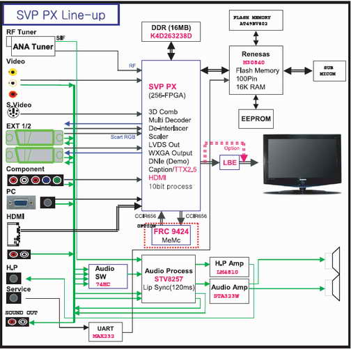 Ну, народ понаписал. Думал сегодня про счастливое завтра пописать, а придется назад возвращаться JuNiK Наверное стоит купить этот мануал за 16$, если он нужен. Это же 1% от стоимости его 2 года назад. Svetik Спасибо за ссылку. Выкладываю блок схему T5. Используется дешевый контроллер от мониторов GENESIS MICROCHIP INC. FLI5921 http://www.gnss.com/products/FLI5961-FLI5962_Prod_Br…C5962-PBR-01B.pdf Раз пошла такая пьянка. Так выглядит M5/6 - High End образца 2005 года. Только не верьте, что там основная микросхема Samsung - это перемаркированный Trident SVP-EX Добавление от 12.04.2007 21:31: цитата:Какие есть опции на выбор? К сообщению приложены файлы: 1.jpg, 519x515, 30Кb, 2.jpg, 580x337, 59Кb |