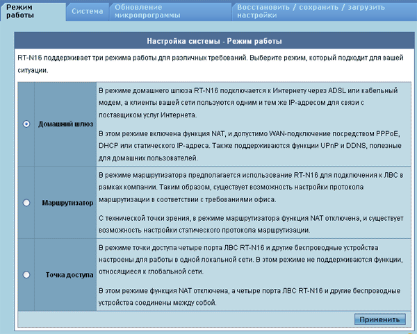 рекомендую ко всем ссылкам на wl500g.info дорисовывать &langid=3 , что бы у тех кто посещает этот сайт впервые была правильная кодировка по ссылке "Прошивки" не упоминается ещё один вариант - asuswrt-merlin (основанный на стоковой asus 3.x, которая в вроде как была основана на tomato) https://github.com/RMerl/asuswrt-merlin - сайт http://www.mediafire.com/asuswrt-merlin/ - файлы RT-N16_3.0.0.4_270.24.zip - последняя версия (не отмечена разработчиком как стабильная, так как у него нет устройства для её тестирования) |