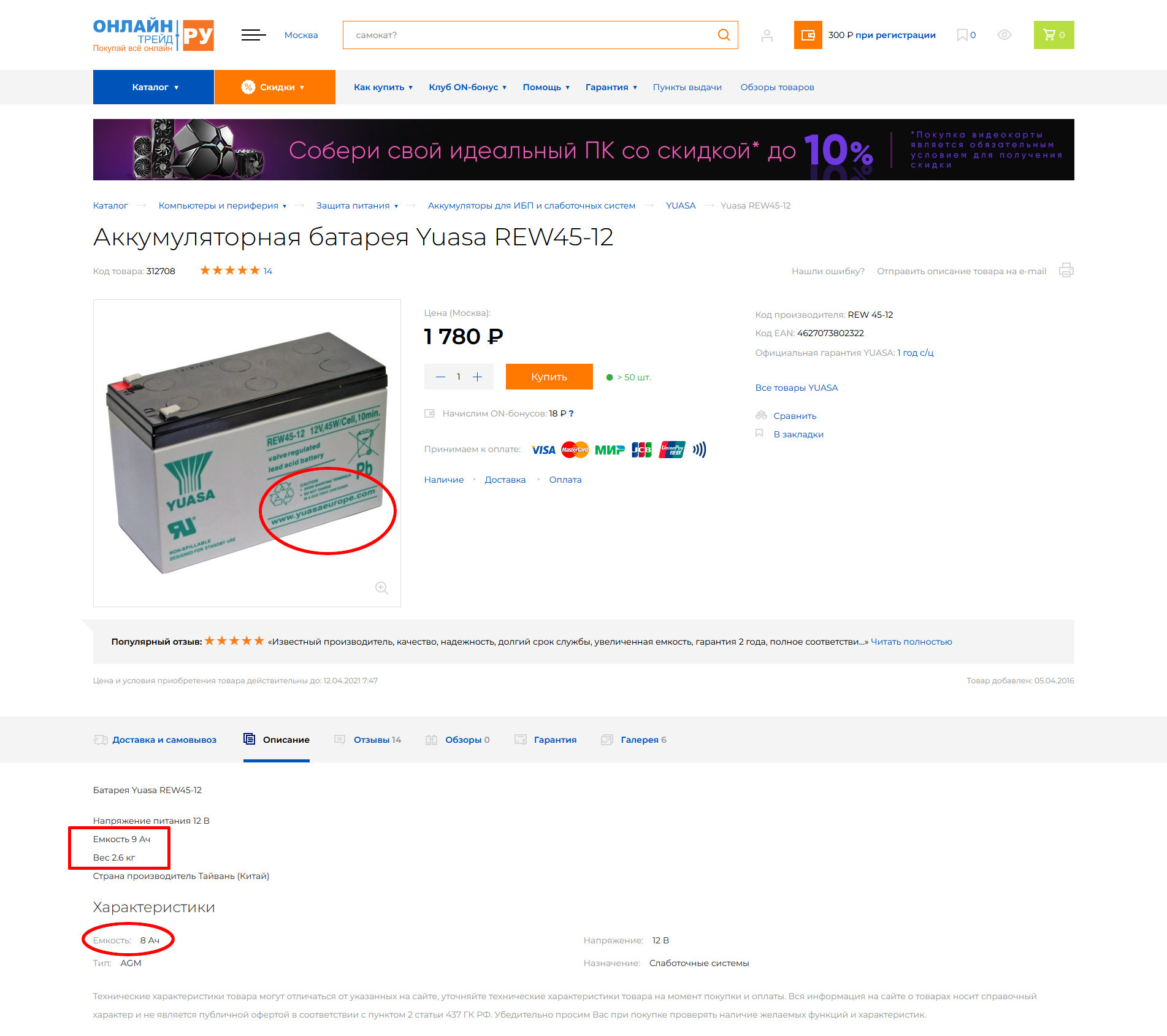Wu-Tang брать такую же csb или классическую, теперь и не знаю, так как на все есть негатив, кто-то BB советует и тд [source=49:8539:5058] Эти хорошие - DSC_0005.jpg на ixbt.photo: (http://ixbt.photo/?id=photo:1348757) Без пенопласта и стекла, по отзывам катод качественный (был) - в подделках и дешёвых свининах плюсовые пластины очень быстро осыпаются. DSC_0006.jpg на ixbt.photo: (http://ixbt.photo/?id=photo:1348762) Перед покупкой желательно посмотреть чем отличаются поддельные Yuasa https://www.yandex.ru/search/?lr=194&offline_search=…D0%BE%D1%80+Yuasa так почему они работали по 6 лет [source=49:8539:5064] Наверное производители захотели больше кушать. пс. неплохо бы проверить напряжение на клеммах зарядившегося аккумулятора подключенного к UPS включенного в сеть - напряжение на полностью заряженной батарее не должно быть выше нормальных 14.7V. Добавление от 17.12.2021 04:18: пс. да, надо было мне сначала на сегодняшнюю цену посмотреть... |